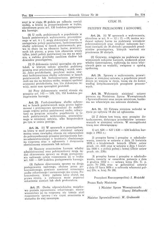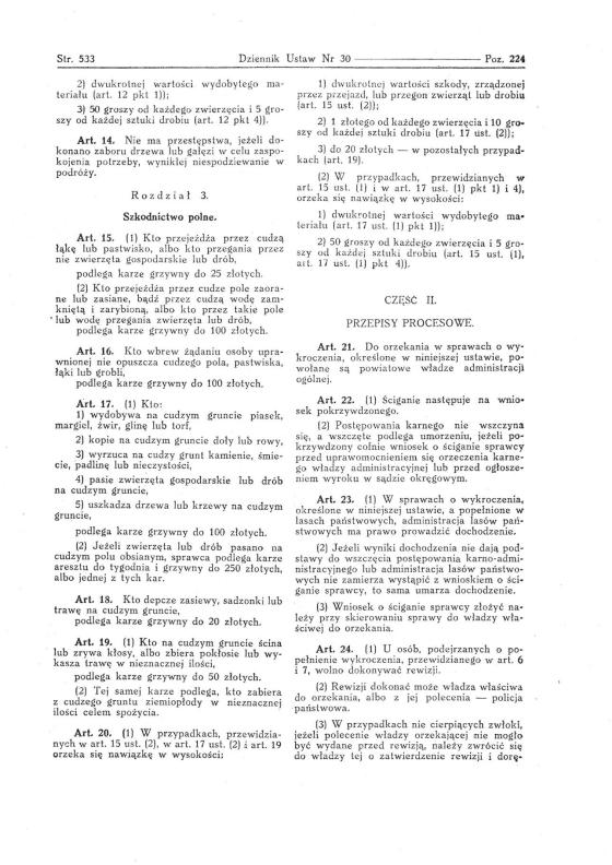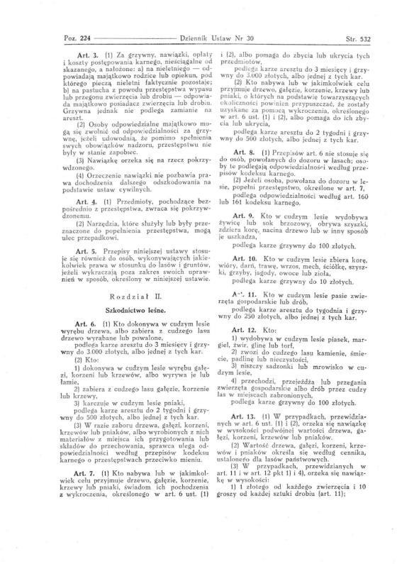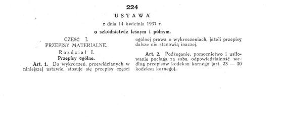 14 kwietnia 1937 roku ukazuje się Ustawa o szkodnictwie leśnym i polnym (Dz. U. R. P. poz. 224) opartej na przepisach prawo o wykroczeniach, prawo karne i postępowanie karno administracyjne. Niestety wojna przerwała dalsze ustawodawstwo w tej mierze.